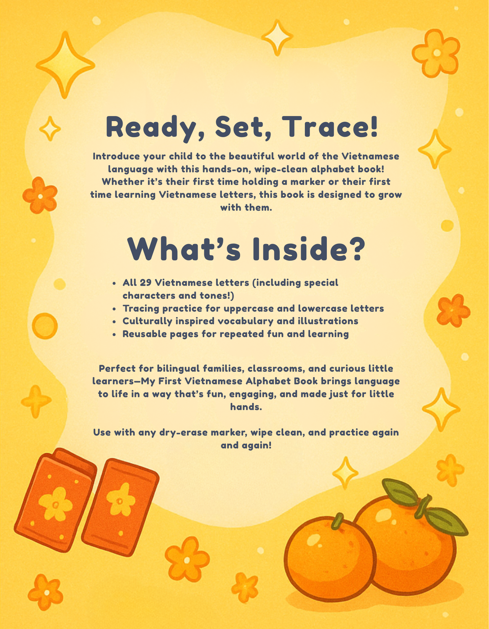 Whether you're a parent, teacher, or caregiver, this reusable alphabet book makes learning to read and write Vietnamese both joyful and accessible—again and again!